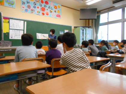 読み聞かせの様子です。2冊も本を読んでいただき、興味津々な1年生でした。