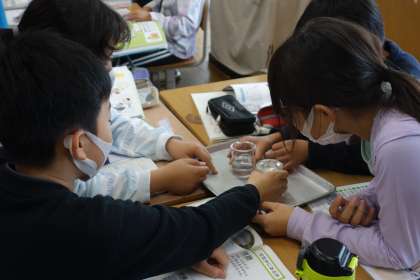覆いをしたビーカーと覆いをしていないビーカーに水の変化を確かめました。水が空気中に出ていく「蒸発」という現象を、確かめることができました。