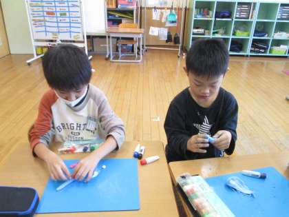 1枚目…道徳の学習、2枚目…紙粘土と絵の具で好きなものづくり、3枚目…学習発表会に向けて 集中して取り組んでいました。