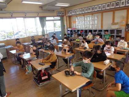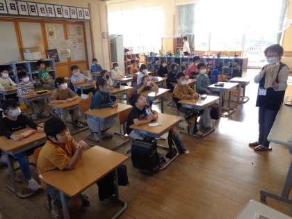 本日は、読み聞かせがありました。民話の絵本を読んでいただきました。最後の交流の時間では、「昔話では、よい人はハッピーエンドに、悪い人はとことんバッドエンドになることが多いよ。」と教えていただきました。またひとつ、お話を読むときの視点が増えました。