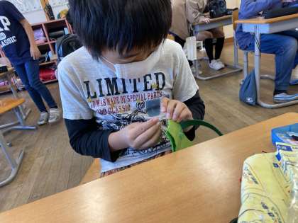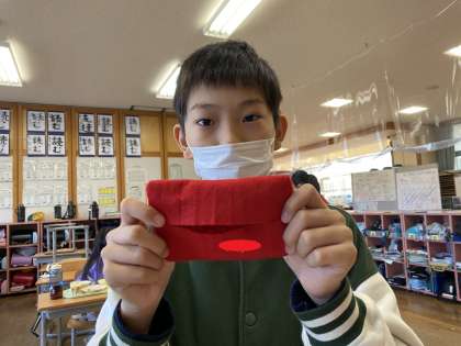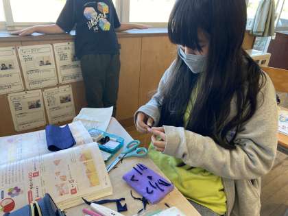 小物作りにチャレンジしています。なみぬい、返しぬい、ボタンつけ、なまえのぬいとり等、学習をいかして自分なりの小物を作っていました。