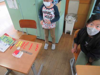 今日の算数科の学習では、かけ算の式を見て、一つ分の数、いくつ分を考えながらおはじきでその式を表しました。