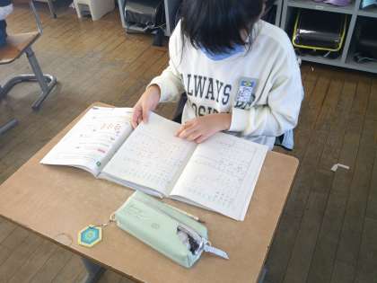 算数の学習の様子です。子供たちは、少し難しいと感じても、簡単に諦めることはしません。前に学習した内容を思い出すために、ノートや教科書を読み返す様子が見られました。「ああ、前のノートに赤で書いてある。」「これと同じ考え使えそう。」とつぶやく姿も見られました。とてもすてきな姿です。