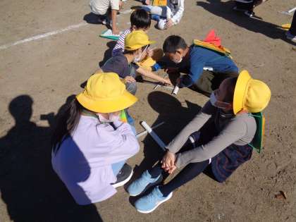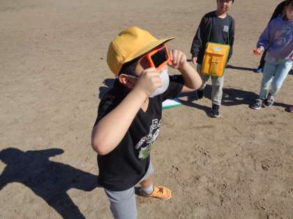 理科では、遮光プレートを用いて太陽を見ました。「月みたい!」という声や、「丸い」といった声が聞こえてきました。また、温度計を用いて日なたと日かげの温度の違いも録しました。初めて見る光景に、いきいきと活動することができました。