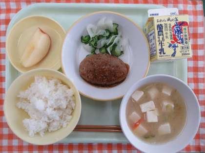 今日の献立は、ごはん、和風煮込みハンバーグ、きざみ和え、豆腐のみそ汁、りんご、牛乳です。