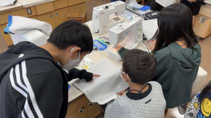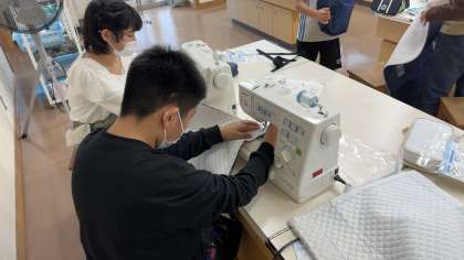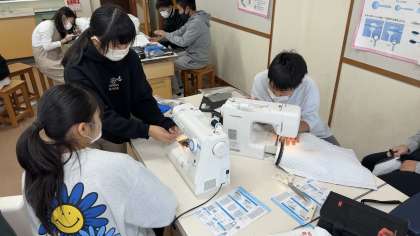家庭科でトートバックをつくっています。目的に合わせて、まちをつくる予定です。