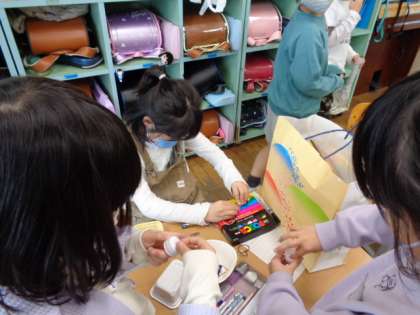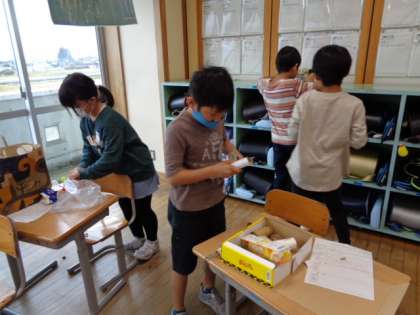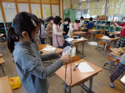 今日の生活科では、集めてきた材料でおもちゃ作りをしました。