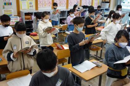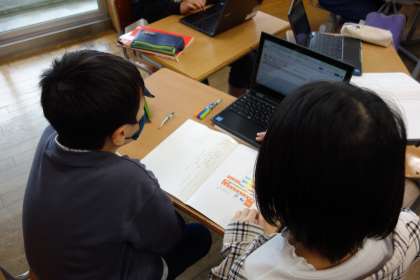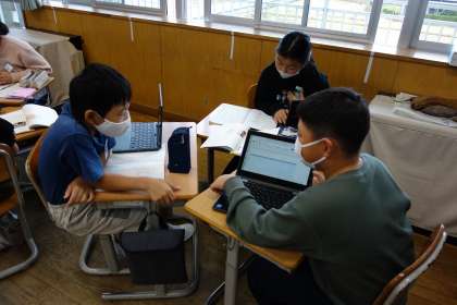 国語科の様子です。説明文から大事な語や文を探し、共同作業で要約をしています。