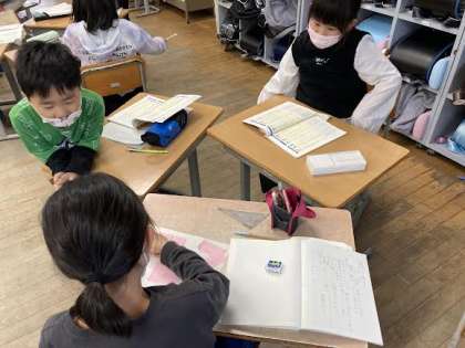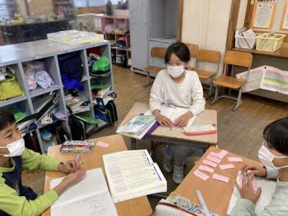 国語科「はんで意見をまとめよう」の学習です。クラスの仲がもっと深まる遊びを班で話し合って決めています。司会が進めたり、付箋に書いた意見を整理したりして、時間内に一つの意見にまとめる難しさを体感したようです。みんな真剣です。