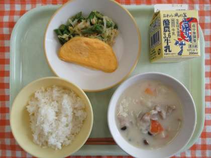 今日の献立は、ごはん、オムレツ、アスパラサラダ、秋の香りシチュー、牛乳です。