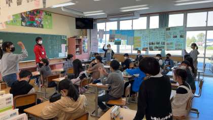 漢字の学習。発表の順番を決めるジャンケンをしています。