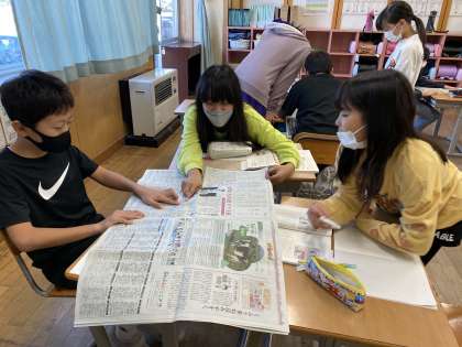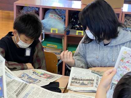 家で新聞をとっていないお家も増えてきた現代。子供たちにとって新聞を手にとって見ることは少なくなっています。今日はそんな新聞をじっくり見て、新聞の工夫を見つけたり、記事をじっくり見てみたりしました。