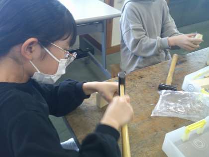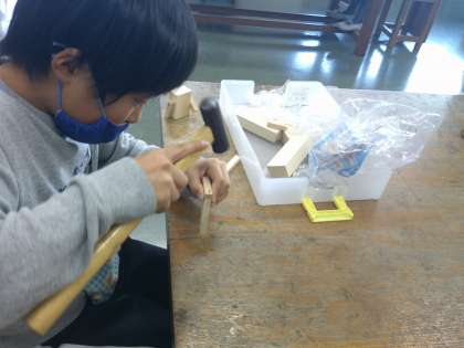 昨日に引き続き、くぎうちトントンをしました。くぎを打っている間に割れてしまった木さえも、子供たちにとってはおもしろい材料になるようです。「割れて小さくなったから、ここに釘を打ってつなげよう」と、創造力をふくらませながら、作品をつくっています。