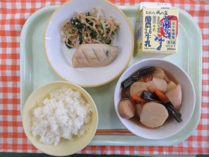 今日の献立は、ごはん、鰆の幽庵焼き、いり大豆和え、おでん、牛乳です。