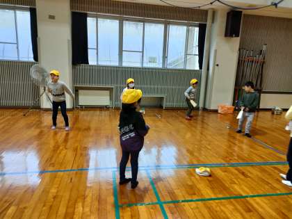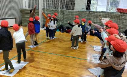 午後の活動は、「立山リンピック」です。1・2ねんせいが力を合わせて、6つの遊びに挑戦します。