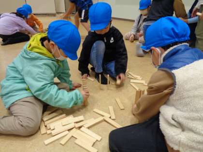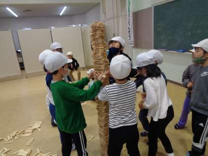 午後からの活動の様子です。ドミノ倒しや新聞紙タワー、わりばしダーツなど、たくさんの室内ゲームを楽しみました。ドミノ倒しでは、班のみんなで協力して自分たちの身長より高いタワーを積み上げたり、ドミノを使ってお城を作ったりと、創造力を働かせて活動に取り組んでいました。今日の活動で一段と縦割り班のみんなと仲良くなることができました。