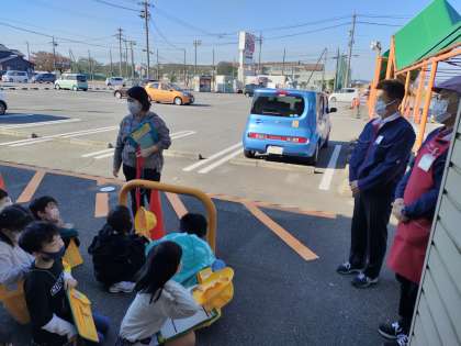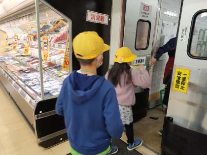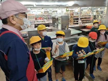 社会科の学習で、アルビス宮野にやってきました。責任者の方々に、店内やバックヤードの中を説明してもらっています。