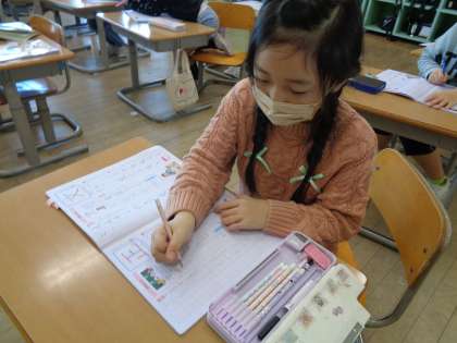 一字一字丁寧に書いています。今日学習した漢字は、「文」と「正」。今日の漢字を見たときに、「文化祭の文だ」や「正っていう字は数を数える時に使うんだよ。」などの発言が出ました。自分が知っていることを教室のみんなに教えてくれて、みんなで学ぶことができた時間でした。