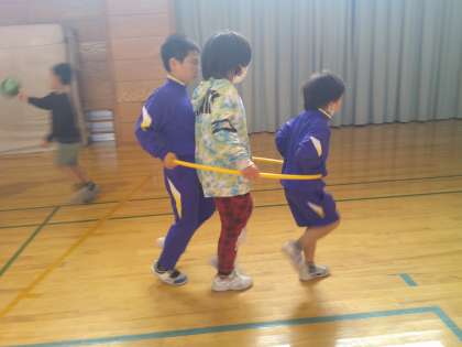 体育館で、のぞみ・あおぞら級合同で運動をしました。おにごっこ、かくれんぼ、キャッチボール、列車ごっこなど友達と仲よく遊びました。上学年の子が下学年の子に優しく接していました。