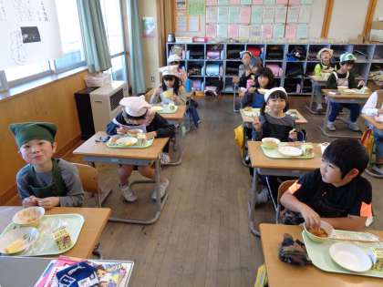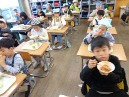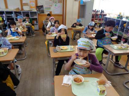 給食の様子です。前を向き、もくもくと食べています。おかわりもたくさんして、元気もりもりに活動する源となっています。