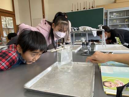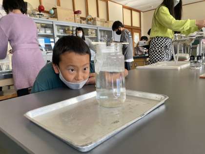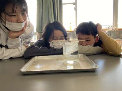 新しい学習がスタートしました。今日は、食塩が水に溶けるときに出る「シュリーレン現象」をみました。「何これ!」「どうなっとるん!?」など子供たちは興味津々です。