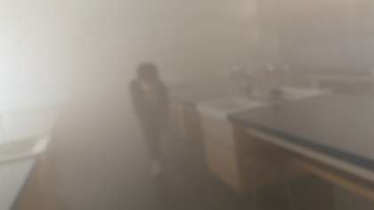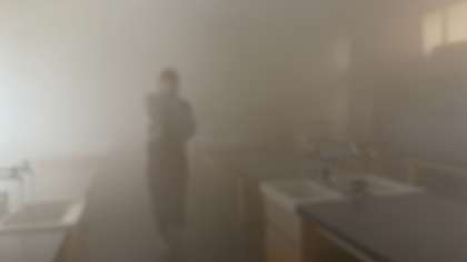 今日の避難訓練の後に、煙中体験を行いました。煙の濃淡を感じながら、煙の恐ろしさを体感しました。
