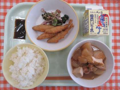 今日の献立は、ごはん、里いもと厚揚げのうま煮、わかさぎのフリッター、梅肉和え、のり佃煮、牛乳です。