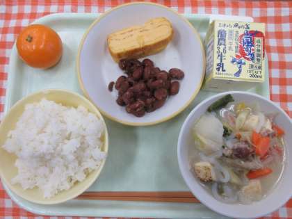 今日の献立は、ごはん、厚焼き卵、煮豆、塩こうじ鍋、みかん、牛乳です。