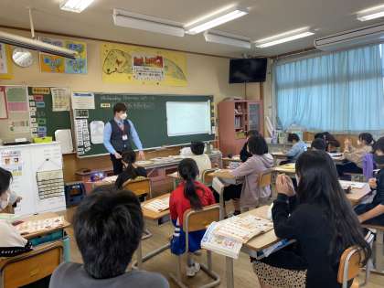 外国語科の学習の中でALTの先生が教えてくださった「スパイゲーム」をやってみました。デザートや飲み物の単語を使って、スパイを探りました。