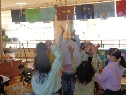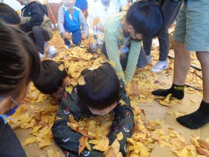 たくさんのイチョウのはっぱに大喜び。「はっぱの雨だー」と言って何回も何回もはっぱを舞い上げて落ちてくるのを楽しんだり、海の中で泳ぐように遊んだりしていました。