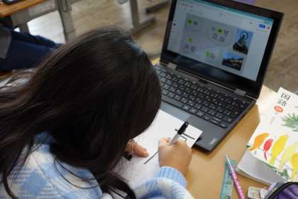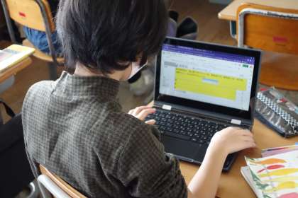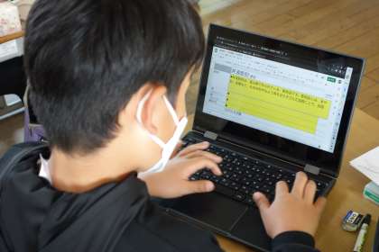 リーフレット作りが進んでいます。ジャムボードで調べた情報を整理したり、段落や文字数を確かめながら下書き(入力)を行ったりして、作業を進めています。