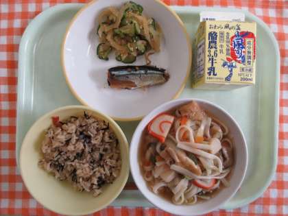今日の献立は、ひじきごはん、サンマの生姜味、華風和え、かしわうどん、牛乳です。