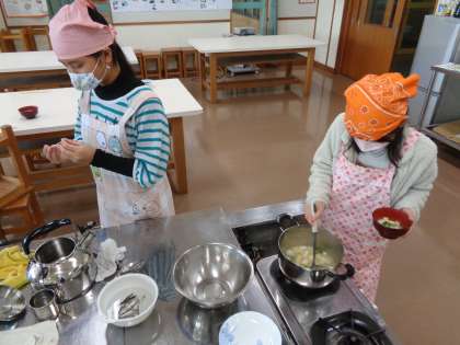 頭とはらわたををとった煮干しでだしをとったり、大根をかつらむきしていちょう切りにしたり、油揚げを油抜きしたりと、慣れない作業を一生懸命頑張っていました。