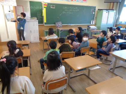 読み聞かせの様子です。「こりすのおかあさん」というお話を読んでいただきました。興味津々な様子で聞いていた1年生でした。