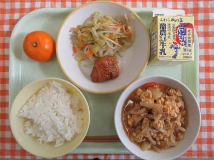 今日の献立は、ごはん、照り焼きチキン、野菜ソテー、卵とじ、みかん、牛乳です。