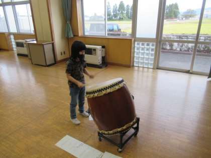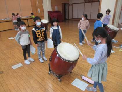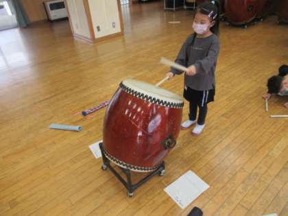 今日の音楽の時間は、前の時間に作ったリズムを太鼓でたたいてみました。