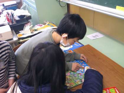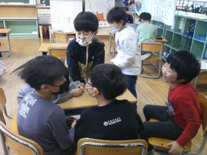 外は雨。今日の休み時間は、教室で友達と一緒に本を読んだり、クイズ大会をしたりして楽しんでいました。