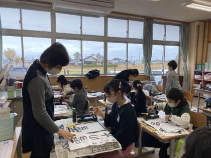 書初大会に向けての練習を始めました。今年の5年生は「雪の大地」を書きます。ポイントを意識しながら一画一画丁寧に書いていました。