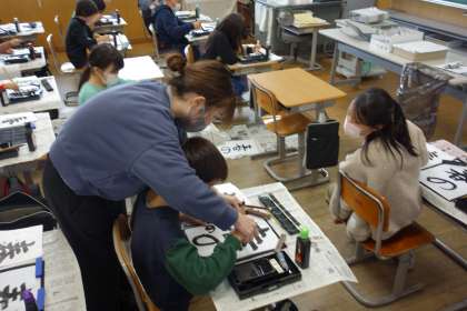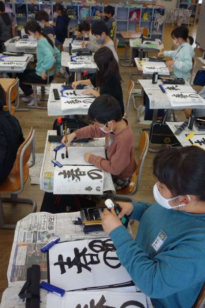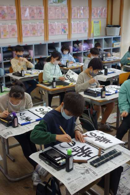 書初練習のシーズンが来ました。今日は、まず半紙で練習です。「の」に苦戦していました。