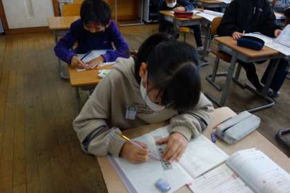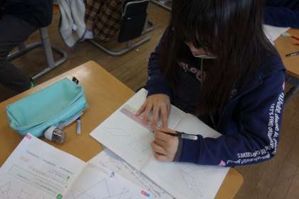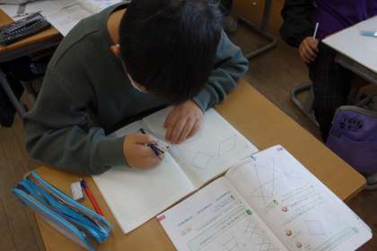 今日は。「台形」と「平行四辺形」という言い方を学びました。ノートの方眼を使って、実際にかいてみました。「平行」を意識しながら、次々と図を描くことができました。
