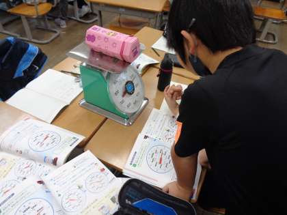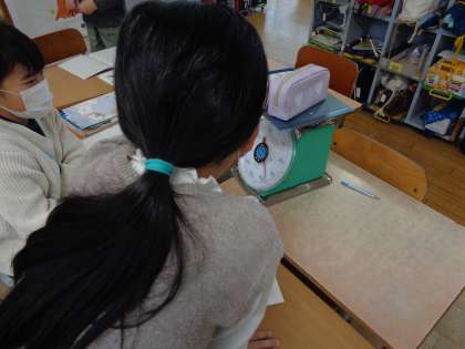 算数かでは、重さの単位について学習しています。本日は、はかりを使って身近にある物のg数を感じました。目盛りの読み方に注意して、班で楽しく活動することができました。