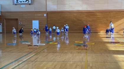 走るのではなく、両足ジャンプでハードルやフラフープをこえていきます。