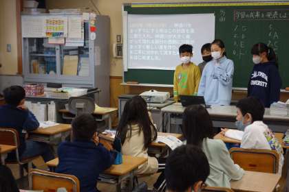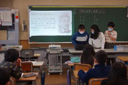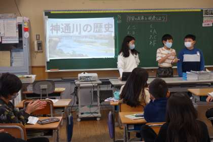 神通川の変化について、調べたことをスライドを用いて、発表しました。「きょう土のすがた」に載っている資料をよく読み、丁寧に発表することができました。互いの発表を聞き合い、理解を深めることもできました。