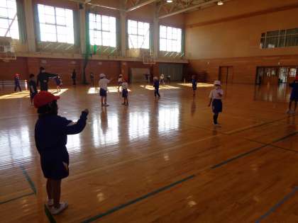 体育の授業では、いろんなジャンプの仕方を練習しました。ジャンプを使ったじゃんけんゲームでは、たくさんジャンプをして楽しんでいました。