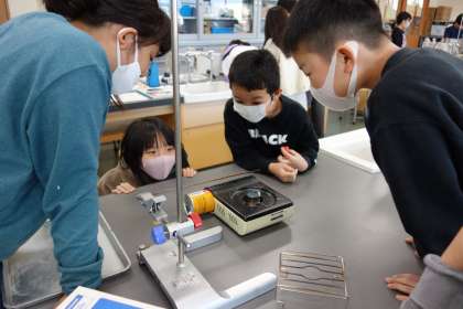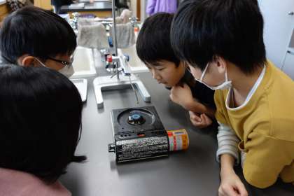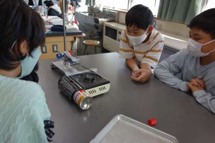 理科では、物の温まり方の学習を行っています。生活経験を基に予想を立て、実験を行いました。予想通りの結果だったようですが、反応に驚く子供たちでした。