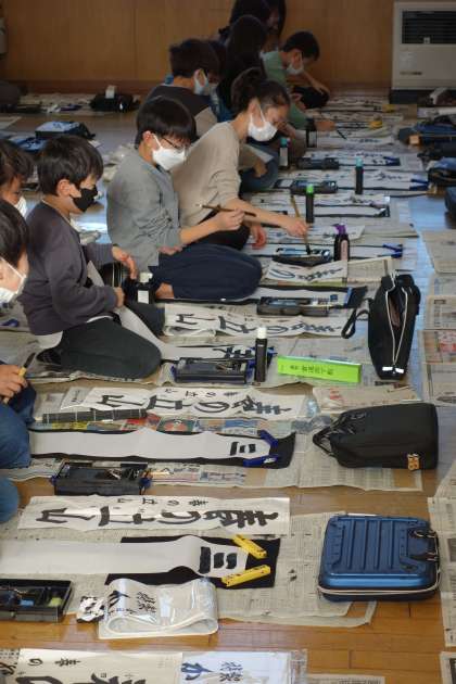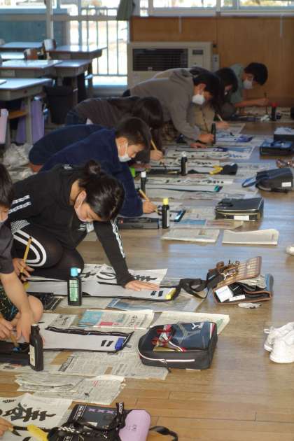 書初大会の練習の様子です。書写担当の先生からポイントを教わり、集中して練習しました。