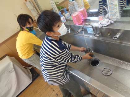 手洗い場の掃除の様子です。排水溝のふたもしっかりタワシでゴシゴシと掃除しました。二人で協力し、気持ちよく掃除を終えることができました。
