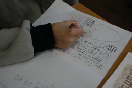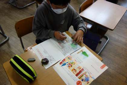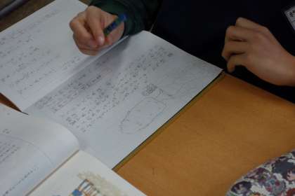 「プラタナスの木」を読み、登場人物の「変化」に着目しながら感想を書きました。実際にプラタナスの木や根をノートに書き、イメージを膨らませていました。