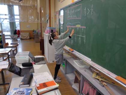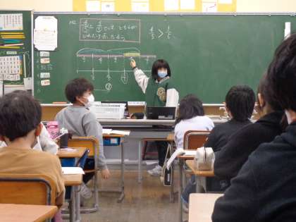 算数かでは、分数の学習をしています。クラスの仲間と一緒に答えに向かって頑張っています。