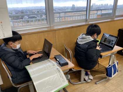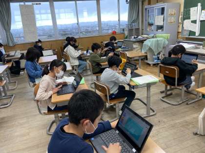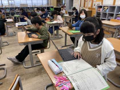 こちらのクラスでもスライド作りを行っていました。真剣に集中しながら作っていました。